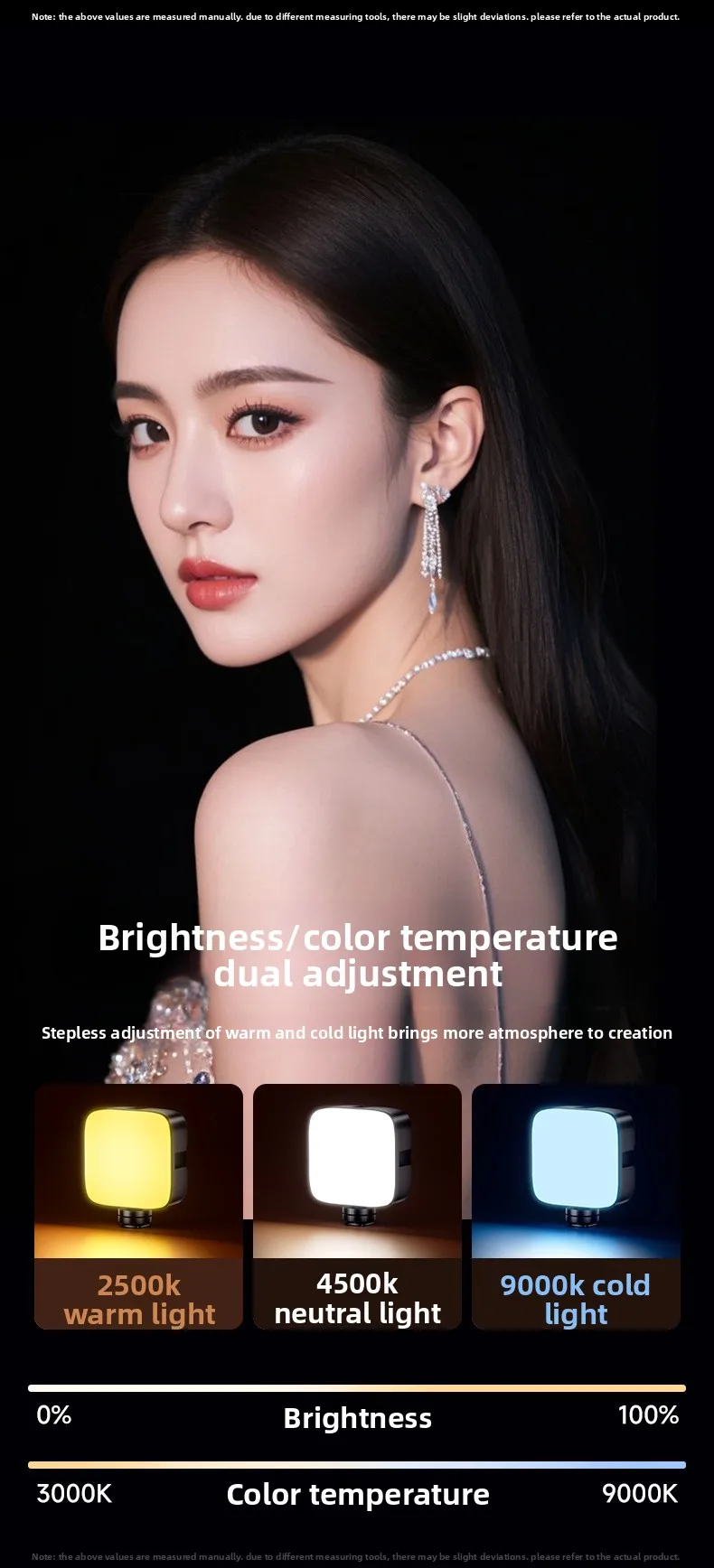Featuring a CRI (Color Rendering Index) of ≥95, this light ensures true-to-life colors and natural skin tones. With 9 adjustable brightness levels (1%–100%), you can fine-tune illumination for any environment, from dim indoor settings to bright outdoor shoots.